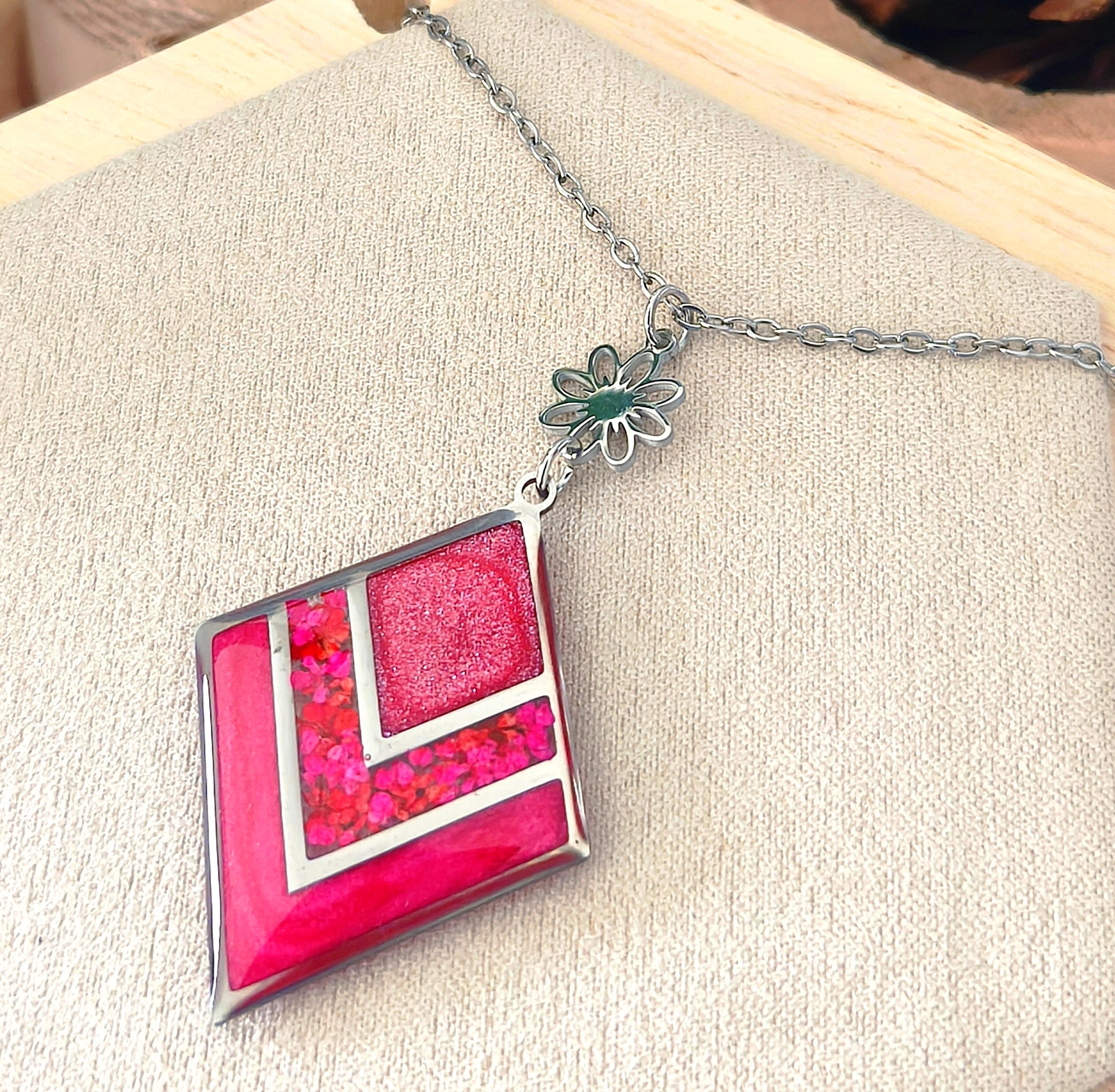 Pendentif en acier inoxydable, résine UV & fleurs séchées